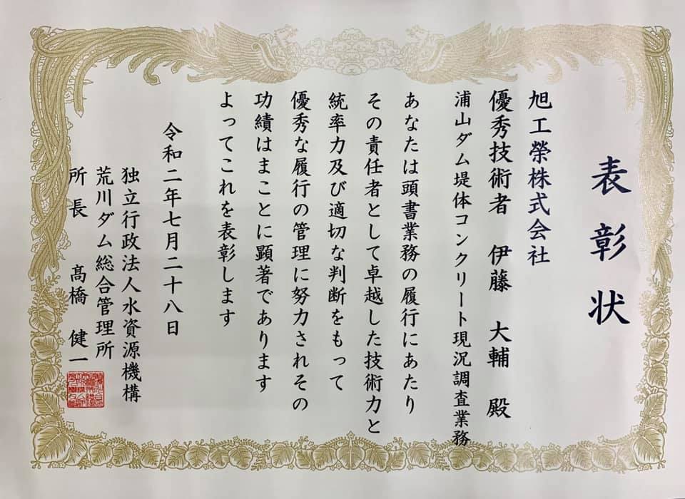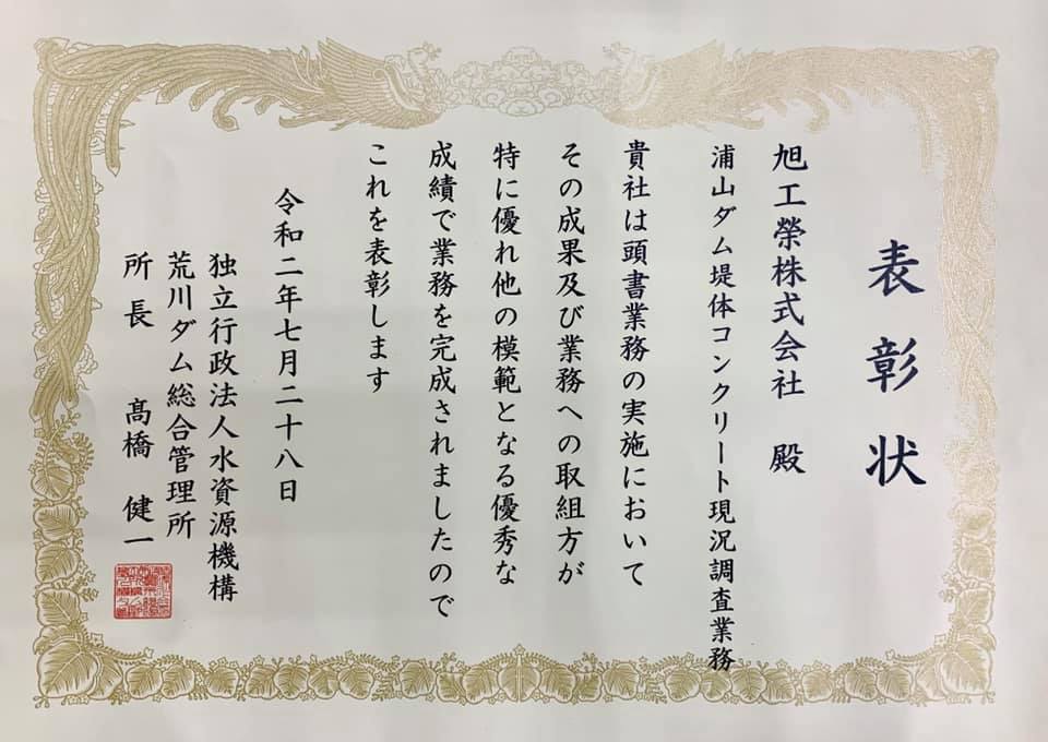 独立行政法人水資源機構荒川ダム総合管理所より、「平成30年度 浦山ダム堤体コンクリート現況調査業務」が、優秀業務として表彰されました。