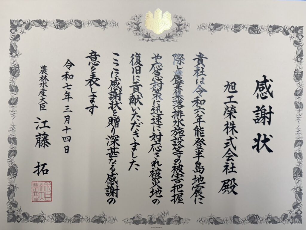 令和6年能登半島地震に際し、被害把握と応急対策に努めた事に関して農林水産大臣より感謝状を賜りました。