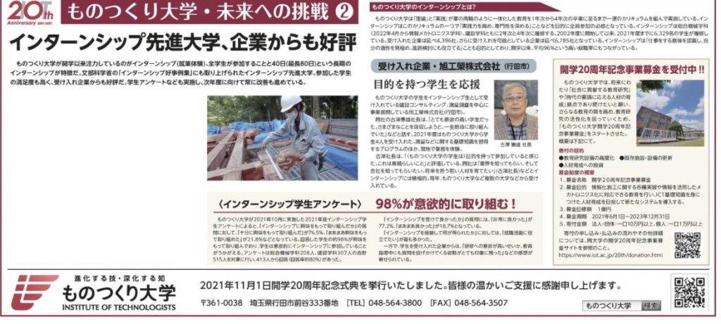 2022/02/25 埼玉新聞に、ものつくり大学開学20周年記念広告が掲載され、そこに弊社もインターンの受け入れ企業として掲載されました。