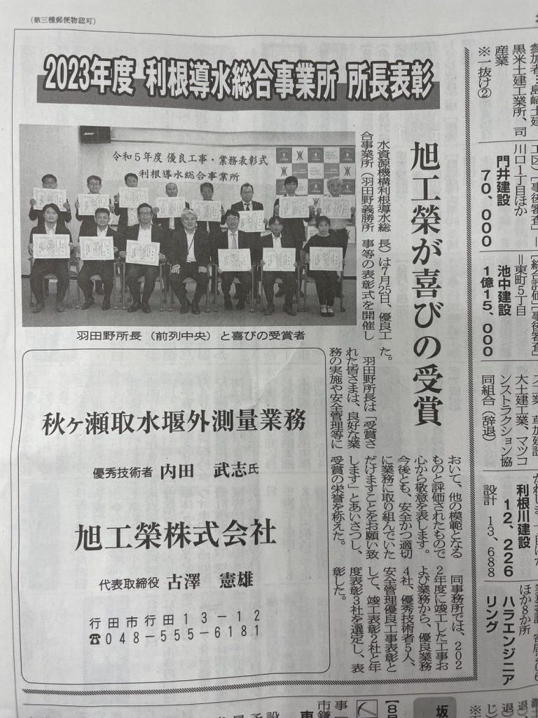 先日受賞しました、「優良業務表彰」「優秀技術者表彰」について埼玉建設新聞に掲載されました!是非ご覧ください。
