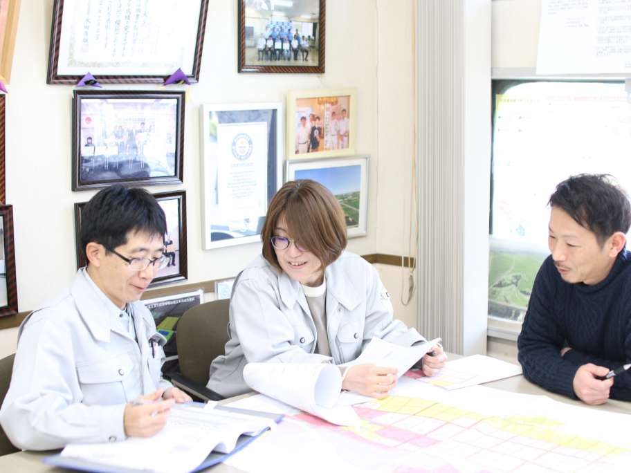 社員一人ひとりの潜在能力を引き出し、成長と活躍の機会を支える環境を整えています。例えば、事務職の女性も積極的に技術の現場に出て測量や図面作成をサポートし、業務の幅を広げています。定年退職を迎えたシニア世代には、無理のない勤務体制を整え、働く意欲を支援。長年培った専門知識・技術を次世代へ継承するとともに、経験の浅い若手スタッフもシニアの指導を受けながら成長し、活躍の場を広げています。また、業務に必要な専門資格の取得を全面的にバックアップし、社員のスキルアップを積極的に支援しています。