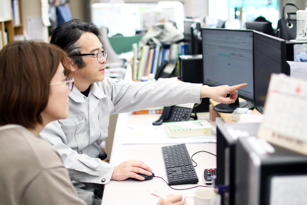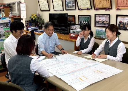 社員一人ひとりの潜在能力を引き出し、成長と活躍の機会を支える環境を整えています。例えば、事務職の女性も積極的に技術の現場に出て測量や図面作成をサポートし、業務の幅を広げています。定年退職を迎えたシニア世代には、無理のない勤務体制を整え、働く意欲を支援。長年培った専門知識・技術を次世代へ継承するとともに、経験の浅い若手スタッフもシニアの指導を受けながら成長し、活躍の場を広げています。また、業務に必要な専門資格の取得を全面的にバックアップし、社員のスキルアップを積極的に支援しています。